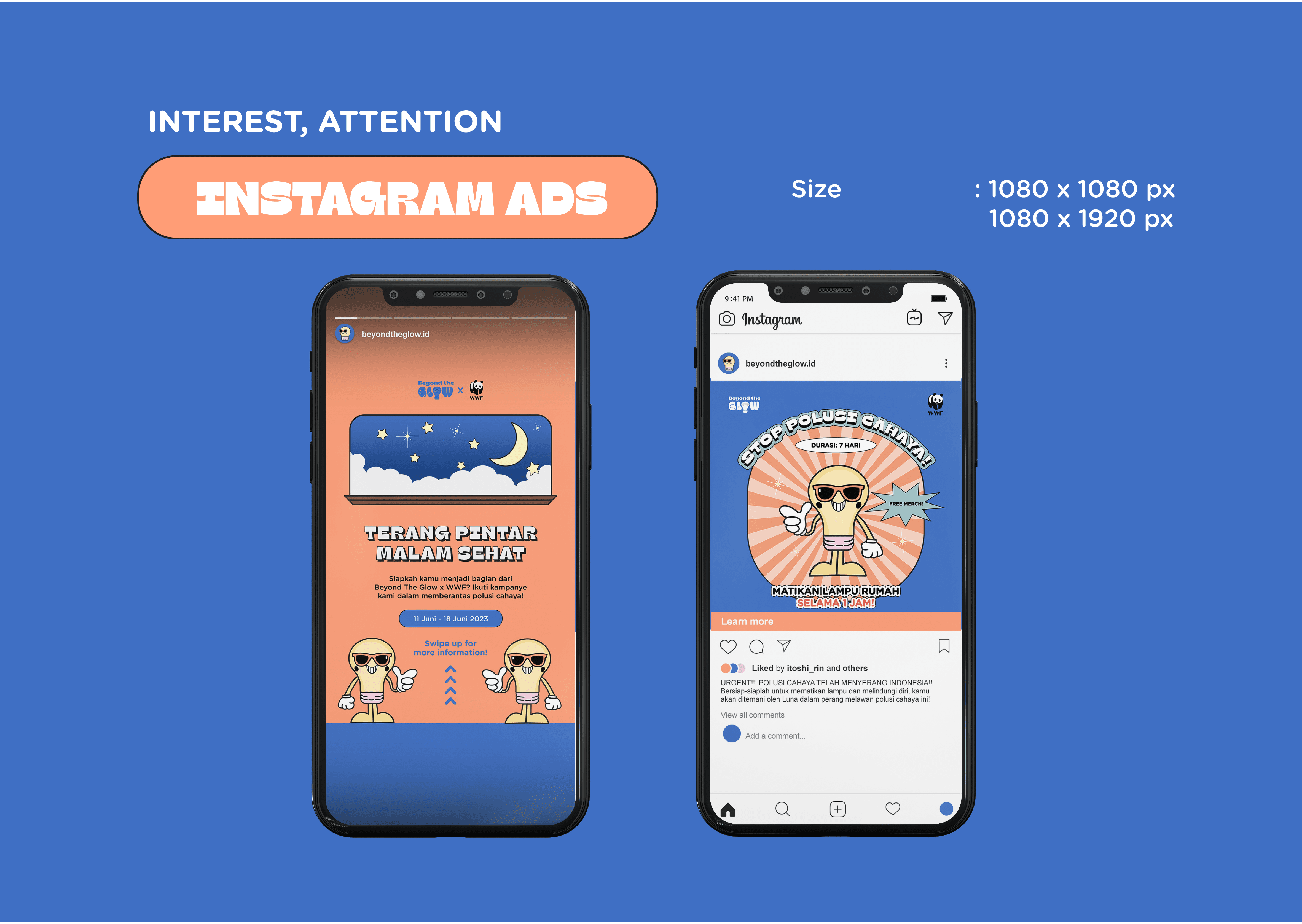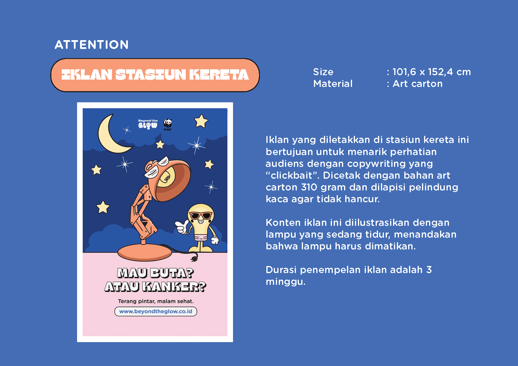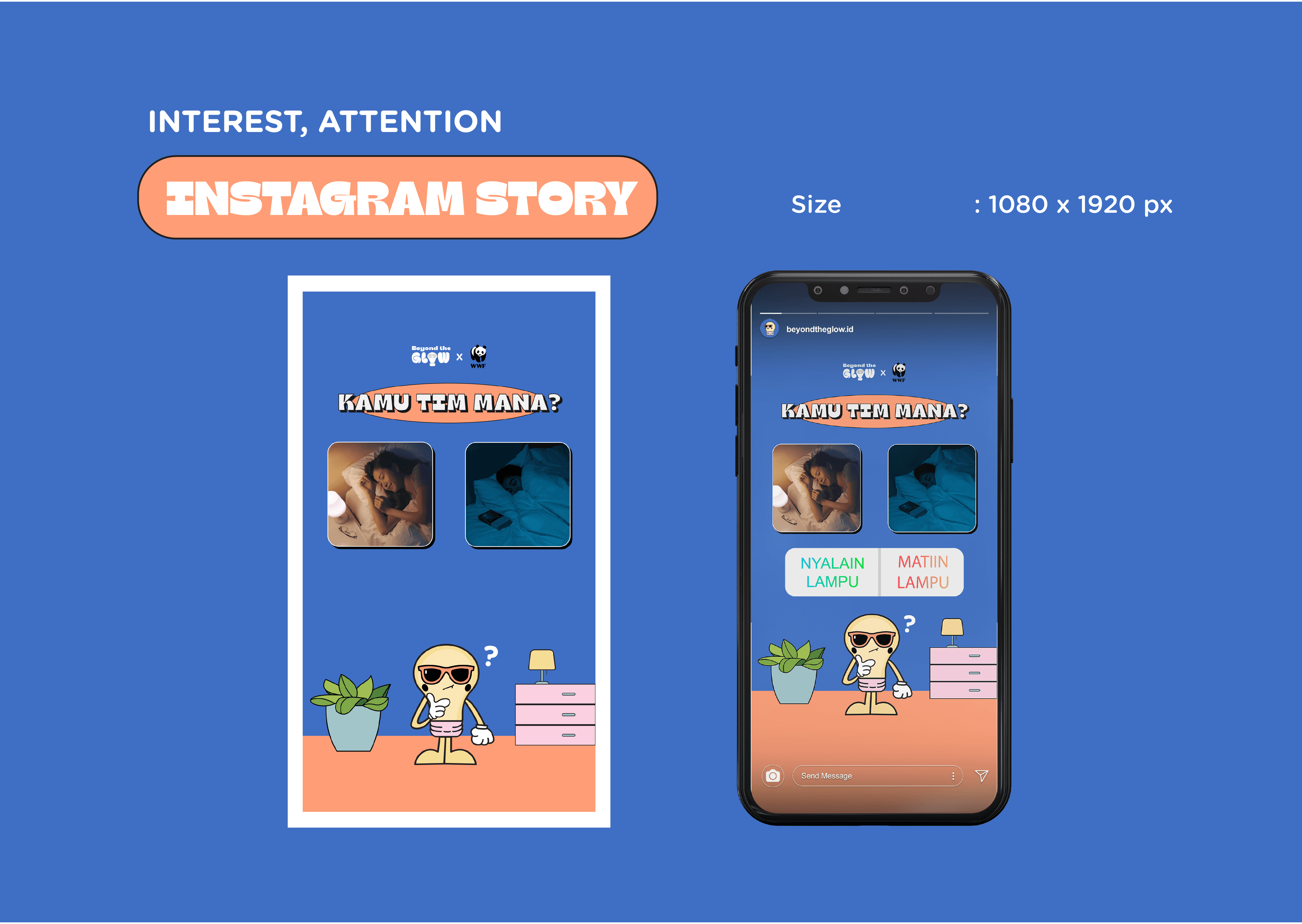 The phrase “less light, more life” is visualized with an image of a light bulb wearing glasses because it is dazzled by its own light. The tactic for conveying the message emphasizes rationality and focuses on the brand mascot, which is designed to be attractive and “more alive.” This mascot will create a happy atmosphere to influence the emotions and mood of the audience, and its cartoonish visual style will further touch the audience's feelings.