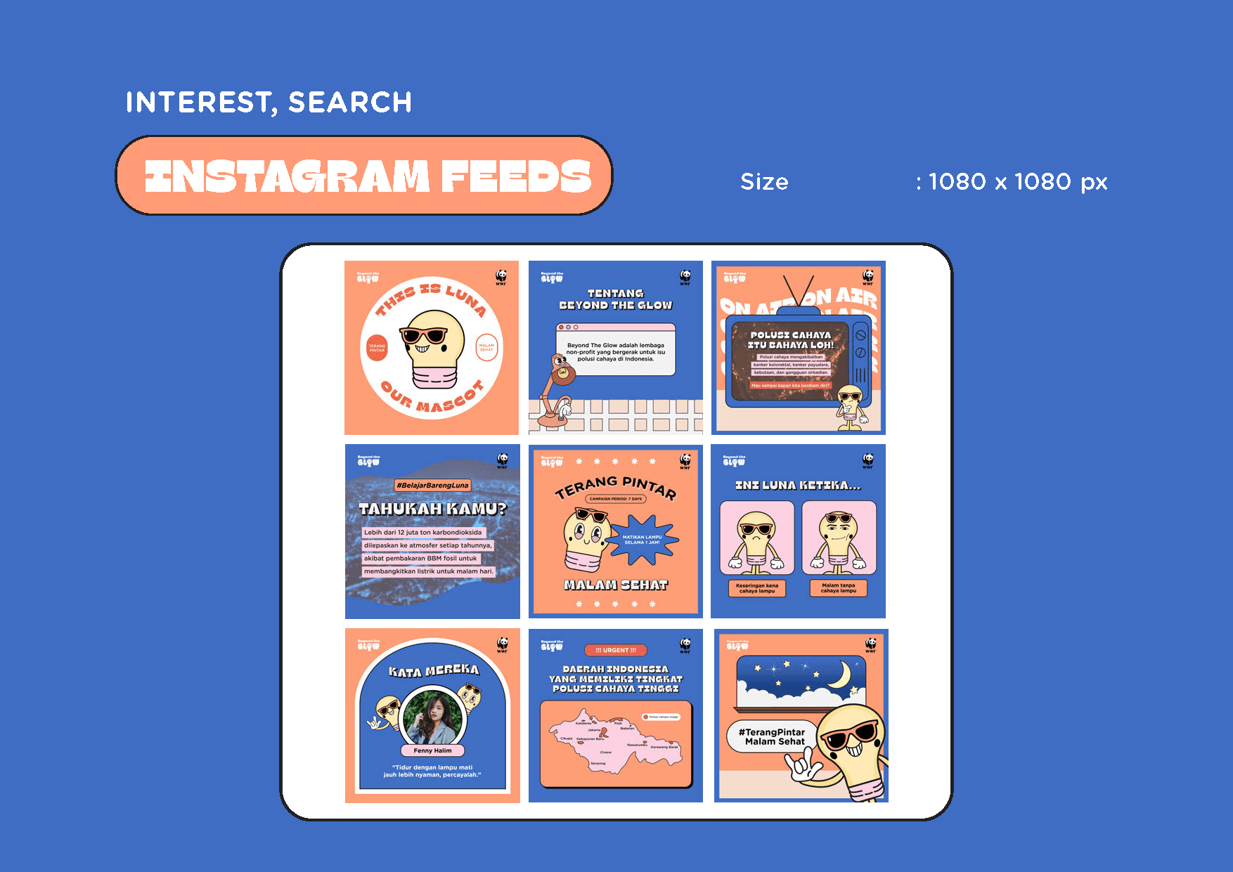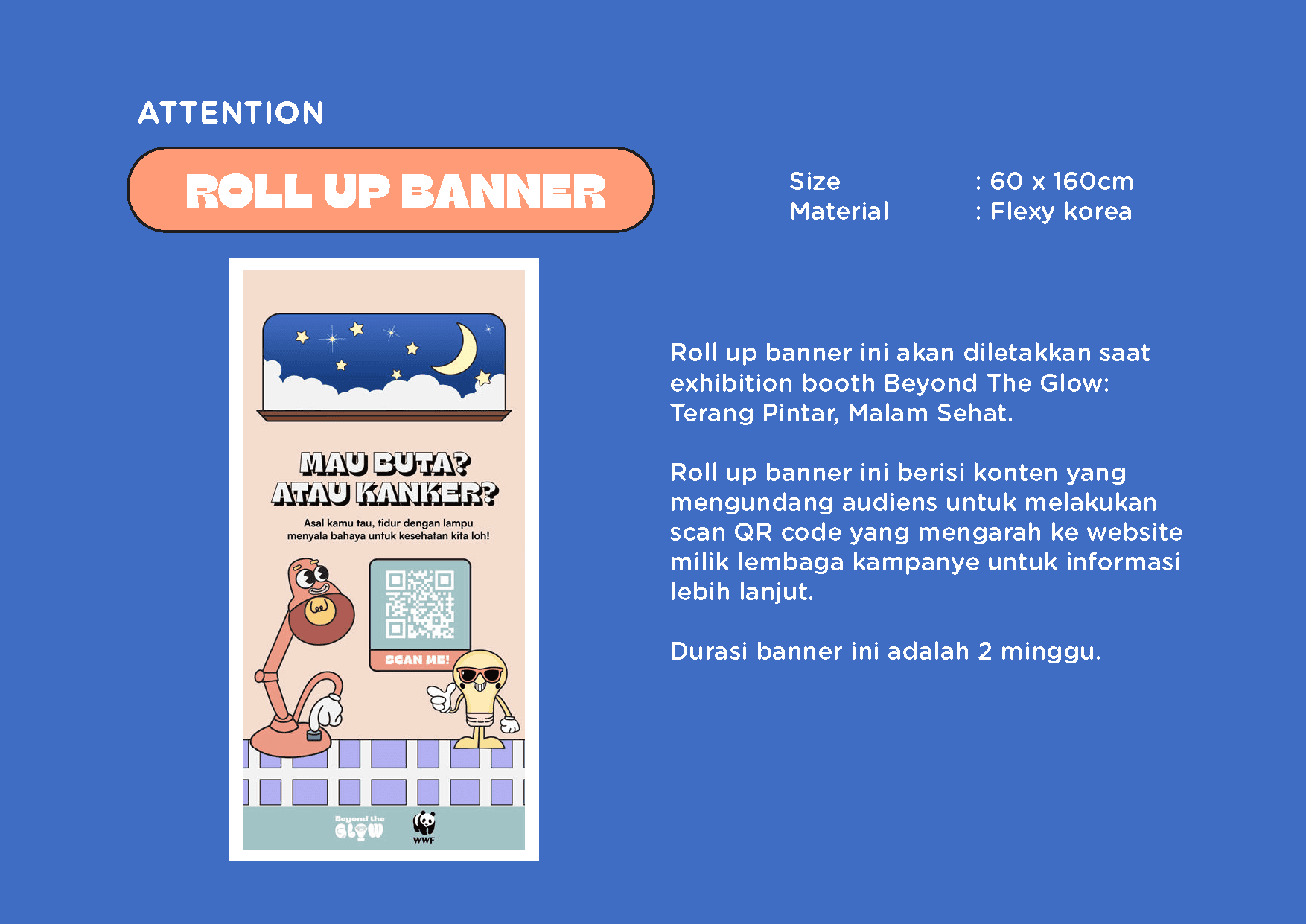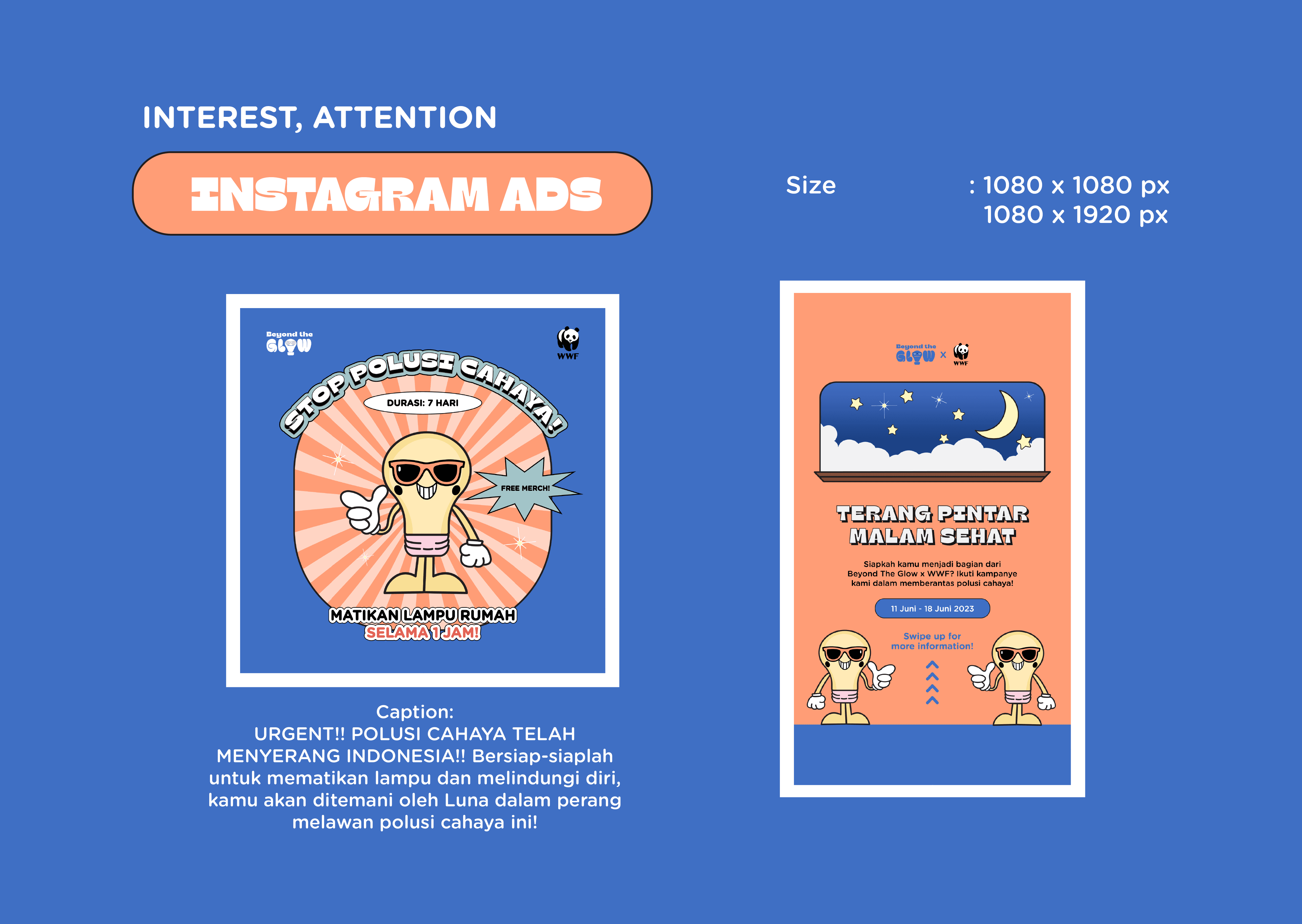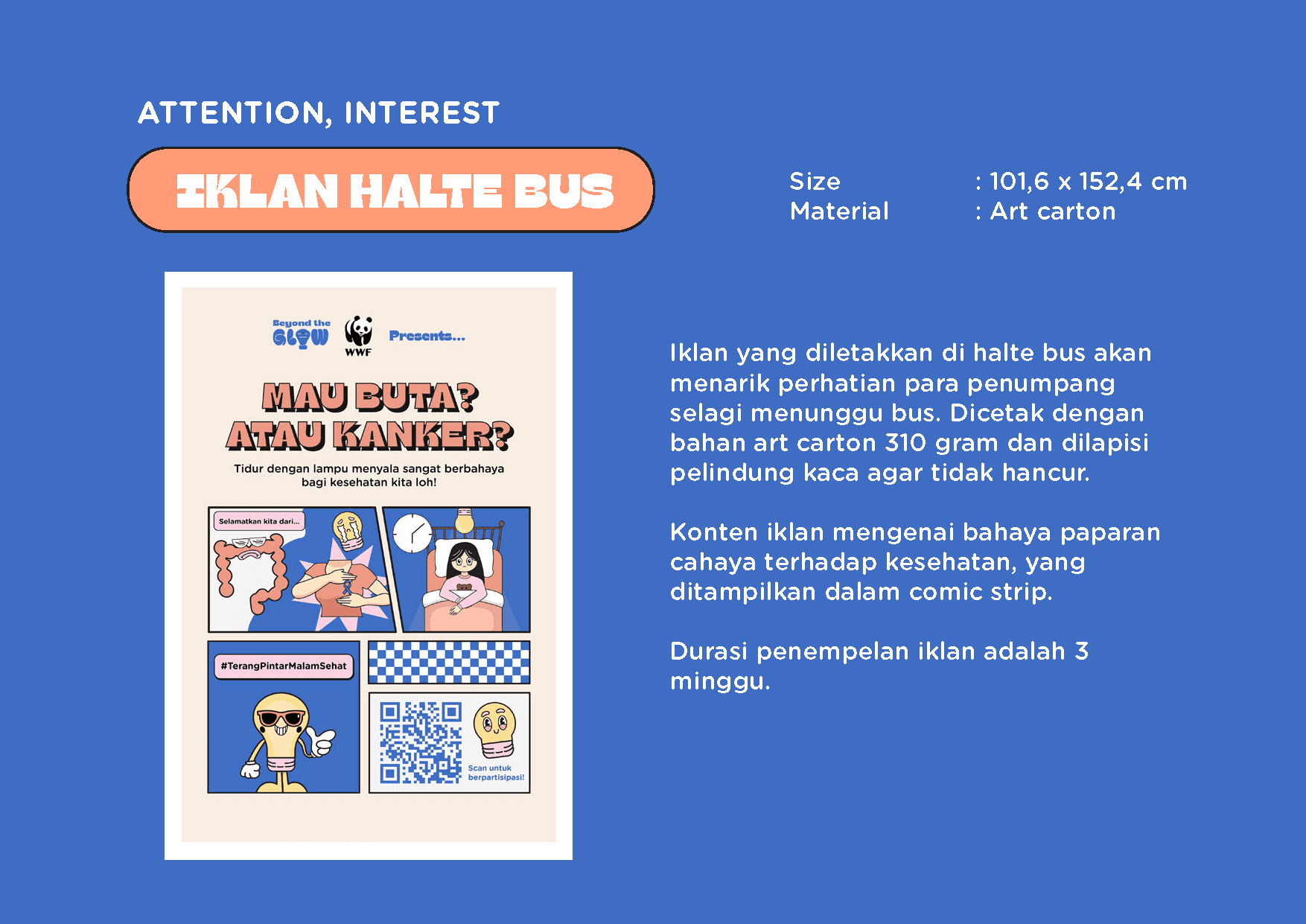 The phrase “less light, more life” is visualized with an image of a light bulb wearing glasses because it is dazzled by its own light. The tactic for conveying the message emphasizes rationality and focuses on the brand mascot, which is designed to be attractive and “more alive.” This mascot will create a happy atmosphere to influence the emotions and mood of the audience, and its cartoonish visual style will further touch the audience's feelings.