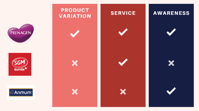 Based on the results of the comparative analysis, it was found that Prenagen is still superior to other competitors in terms of product and brand awareness. Prenagen's product superiority can be seen from how they always carry out cutting-edge innovations for their products, as evidenced by the fact that Prenagen currently has formula milk products for mothers before pregnancy, during pregnancy, and after pregnancy. Additionally, Prenagen's advantage in terms of brand awareness can be seen from the number of followers on social media. Prenagen has 392k followers on Instagram, Anmum has 74k followers, and SGM Bunda has 45k followers.