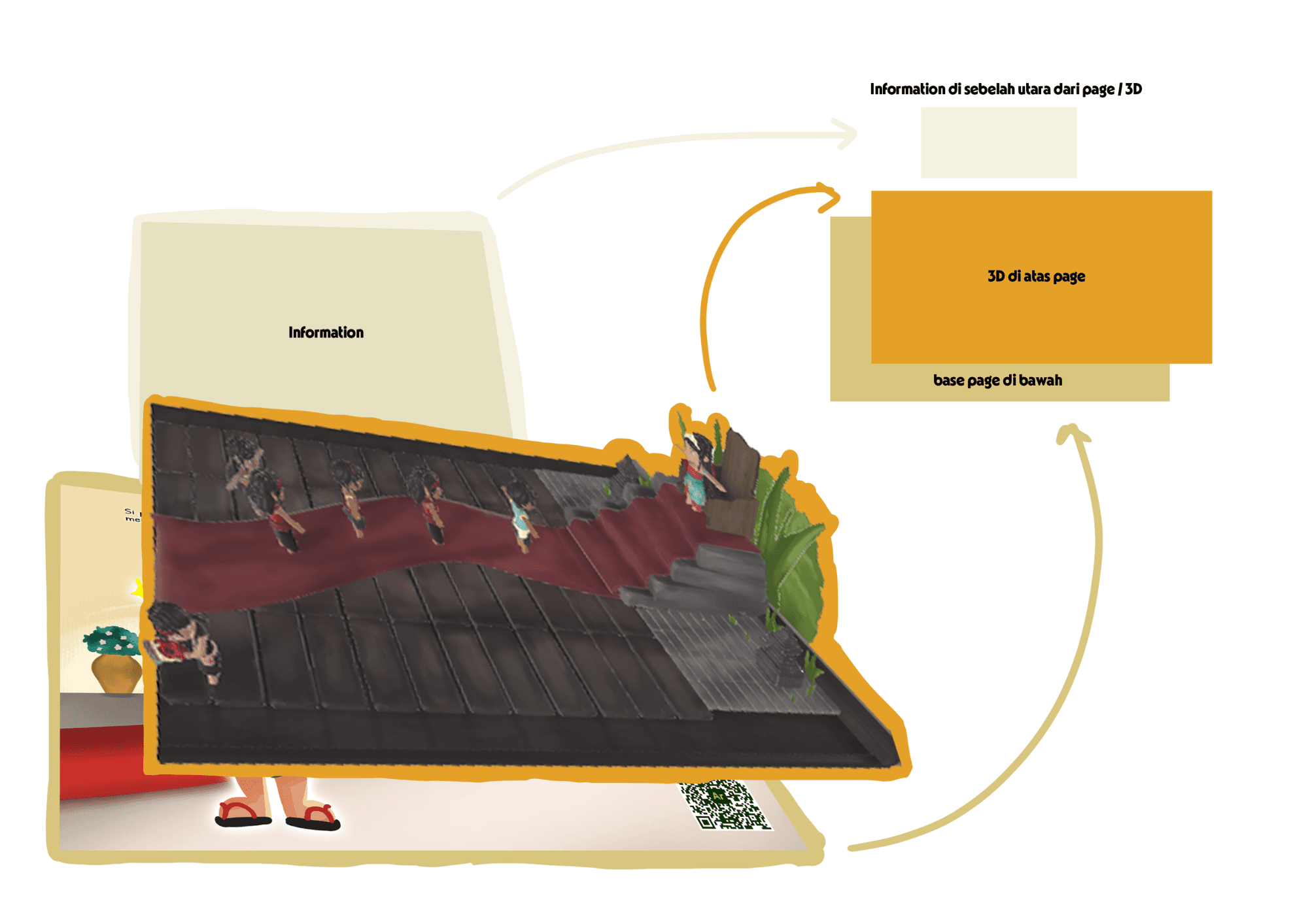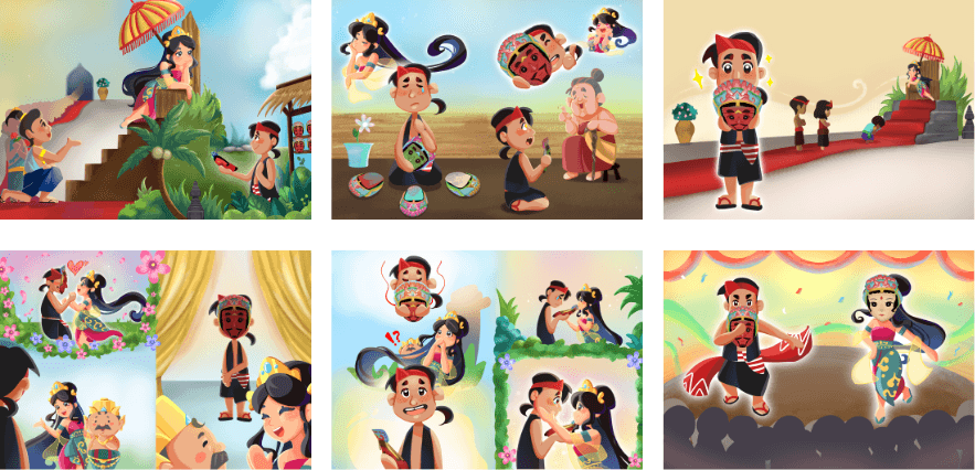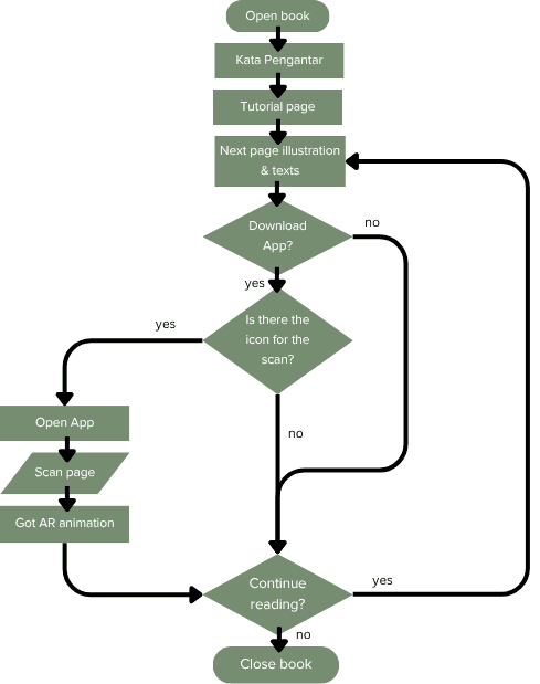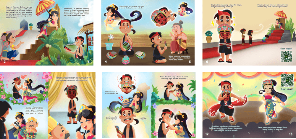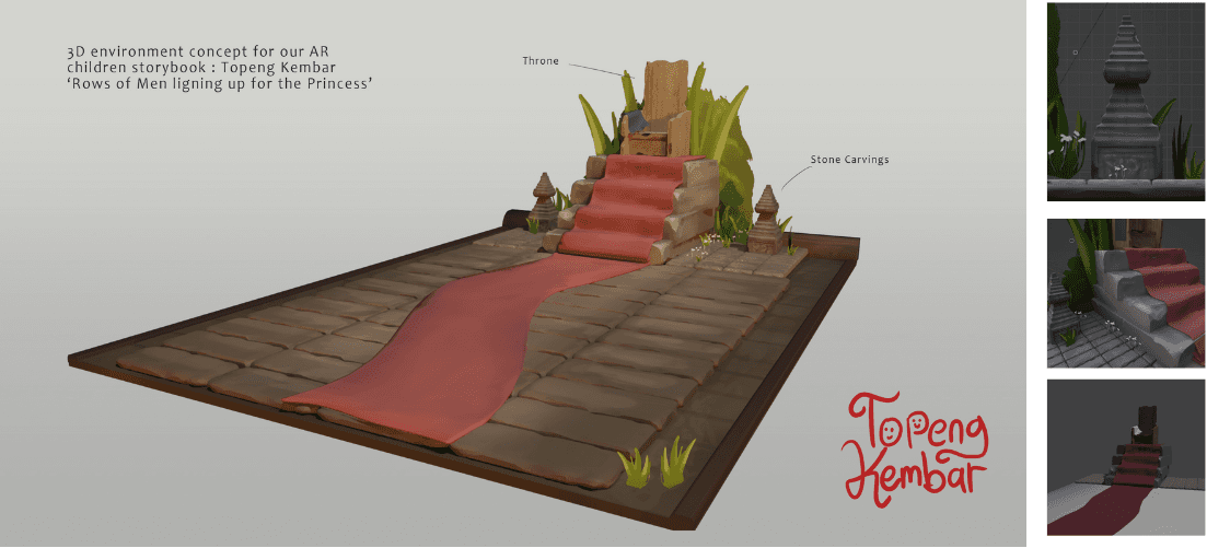 Creating an interactive AR storybook from a folklore called ‘Topeng Kembar’. By using AR we can improve the reading experience of illustrated books through the use of 3D visuals, sound and animation to help engagement in reading books. We wanted to make the illustrated storybook more interactive and fun so that it can become a medium that children often use to read books. The story ‘Topeng Kembar’ where the characters face challenges, doubts and fears, to discover the transformative power of using their own skills.
